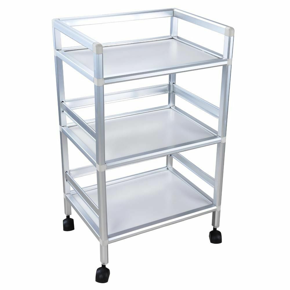 This is an excellent multi-purpose use Salon Cart! It’s wide enough to hold anything from microdermabrasion machines to galvanic machines. Also, you may clamp on a maglamp and roll the cart near your client for example. A lot of machine wands and tips may be placed on the there as well for example. The multi-purchase uses are pretty endless. Also, massage therapists may want to use this type of cart to place their lotions and oils on for easy access. Not only salons can use this, tattoo artists as well would benefit from putting their tattoo gun and ink on as well. It’s metal framing allows it to take heavy weighted items and still feeling sturdy. Also, the wheels are high quality and move very easily.